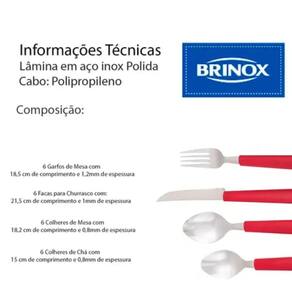 - Composição: lâmina de aço inox, cabo de polipropileno - Dimensões: Garfo de Mesa: 18,5cm Comprimento x 1,2mm Espessura Faca de Churrasco: 21,5cm Comprimento x 1mm Espessura Colher de Mesa: 18,2cm Comprimento x 0,8mm Espessura Colher de Chá: 15cm Comprimento x 0,8mm Espessura