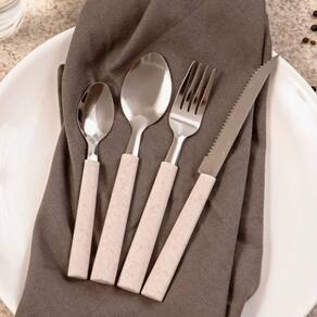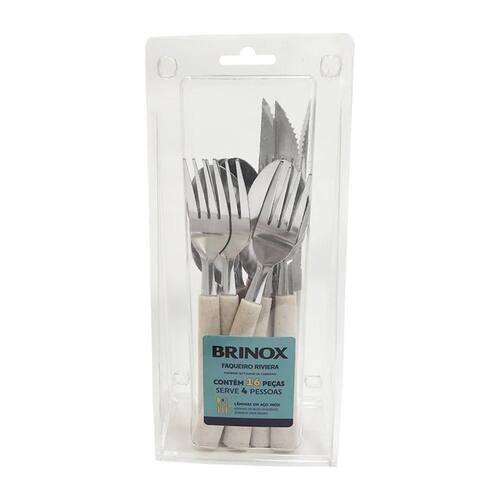 - Marca: Brinox - Linha: Riviera - Composição: lâmina de aço inox, cabo de polipropileno - Dimensões: Garfo de Mesa: 18,5cm Comprimento x 1,2mm Espessura Faca de Churrasco: 21,5cm Comprimento x 1mm Espessura Colher de Mesa: 18,2cm Comprimento x 0,8mm Espessura Colher de Chá: 15cm Comprimento x 0,8mm Espessura