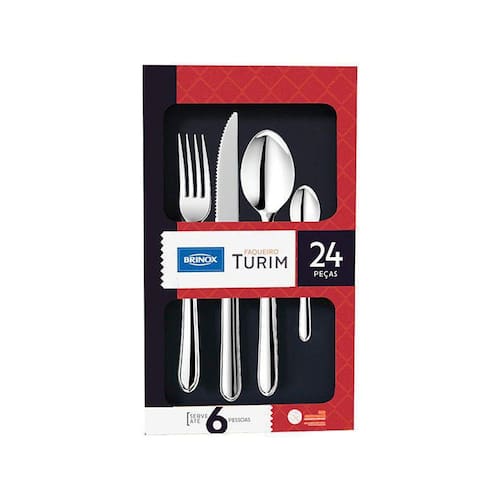 Faqueiro Brinox Inox Turim 5111/142 - 24 Peças A Linha Turim é uma aliada no dia a dia. Os talheres proporcionam resistência, segurança e garantem uma rotina eficiente. Os talheres são feitos de aço inox com acabamento polido, e os cabos apresentam um friso que é marca da linha. Este faqueiro de 24 peças contém talheres para servir uma refeição para seis pessoas: colheres e garfos de mesa, facas de churrasco e colheres de chá. Todos os utensílios podem ir à lava-louças. Acabamento vibrado Facas com polimento extra brilho Espessura: 2 mm da faca Espessura: 1,2 mm do garfo e colher ESPECIFICAÇÕES Material Aço Inox Linha Turim Composição 01 Faqueiro 24 peças, compacto - Turim Garantia 90 dias para vícios ou defeitos de fabricação. Ean: 7896502838806