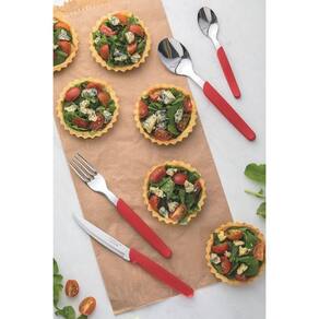 As cores da linha Carmel trazem mais alegria para a mesa, tornando qualquer ocasião em um momento super especial. Com o Faqueiro Tramontina Carmel com Lâminas em Aço Inox e Cabos de Polipropileno Carmín Médio 24 Peças você poderá montar um serviço de mesa diferenciado, delicado e apaixonante. Os talheres são produzidos com lâminas em aço inox e espessura que mantém as suas formas inalteradas, mesmo com uso intenso, contando com cabos de polipropileno altamente durável. As facas têm maior durabilidade, pois as lâminas em aço inox recebem tratamento térmico. A escolha certa para quem busca por peças que levam toda a qualidade da Tramontina, sem deixar de lado a sua beleza.