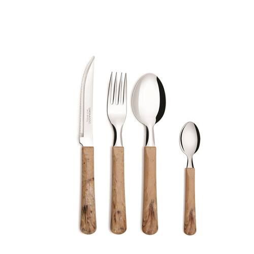 Faqueiro para 6 pessoas com desenho Travertino Talheres com pegadores de plastico, não sai ao lavar. Composto por: 6 colheres de mesa 6 garfos de mesa 6 Facas de carne com serrilha 6 colheres para chá ou café ou sobremesa Material Aço inox e plastico. Marca: Não Informado Ean: 7896211816430