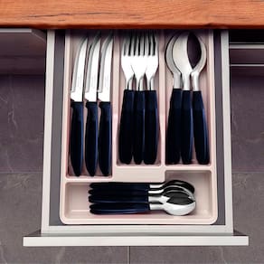 Os cabos são produzidos em polipropileno e garantem maior conforto no manuseio, além de deixar sua mesa muito mais moderna. Ele ainda acompanha um gaveteiro, perfeito para armazenar suas peças. Com certeza, a escolha ideal para sua cozinha!