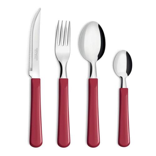 Faqueiro sintonia vermelho com pote 25 peças Produzido em aço inox com cabos de plástico, a linha sintonia é diferenciada por sua ergonomia e estética, uma linha em sintonia com a inovação e a versatilidade. O brilho inédito do cabo e qualidade da sintonia surpreende e encanta na mesa. Contém: 6 facas de carne / 6 garfos de mesa / 6 colheres de mesa / 6 colheres para sobremesa / 1 pote com tampa 1,65l Cor: Vermelho Material: Aço Inox Medidas da embalagem: 15cm comp. X 26cm alt. X 15cm larg. Peso: 0,840kg