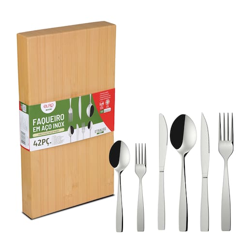 O Faqueiro Strauss Flat da Euro Home é ideal para quem busca sofisticação e resistência. Com 42 peças em aço inox, serve até 6 pessoas com praticidade e elegância.