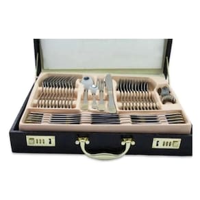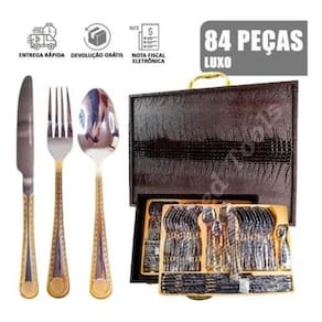 Faqueiro Inox 84 Peças Banhando Ouro 24k Faqueiro 84 peças em aço inoxidável 18/10 3.0mm de espessura com filetes banhado A ouro 24k, design exclusivoproduto novo, com E nota FISCALUm bom faqueiro leva charme, elegância e bom gosto para a composição da sua mesa. Produzido em aço inox, ricamente adornado e exclusivo. Apresentam espessura de 3mm e acabamento espelhado. Maleta de armazenamento produzida em material sintético, com fechamento por sistema de senha. O produto POSSUI:12 Colheres12 Garfos principais12 Facas principais12 Garfos sobremesa12 Colheres sobremesa12 colheres café01 Espátula pata bolo02 Garfos peixe01 Concha grande01 Concha pequena01 Colher açucareiro01 Pegador02 Colheres para servir02 Colheres de saladaINSTRUÇÕES de abertura da maleta: - insira a senha: 0000- afaste as travas para os lados Marca: Não Informado