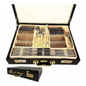 Faqueiro Inox 84 Peças Detalhe Dourado Luxo Faqueiro 84 Peças em Aço Inoxidável 18/10 3.0mm de espessura com filetes dourados, design exclusivo e sofisticado faqueiro leva charme, elegância e bom gosto para a composição da sua mesa. Um faqueiro clássico produzido em aço inox, ricamente adornado e exclusivo. todas as peças são produzidas em aço inoxidável. Apresentam espessura de 3mm e acabamento espelhado. caixa produzida em courino, estilo maleta reforçada com fechamento em sistema de código.