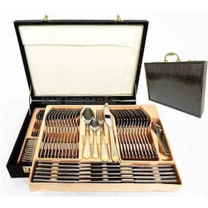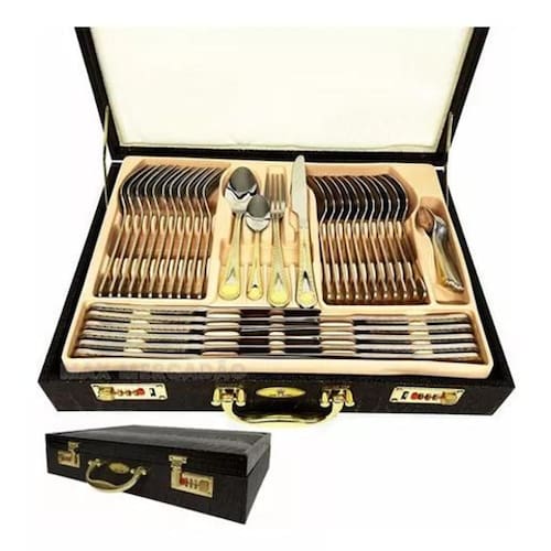 01 Maleta com: 12 Colheres 12 Garfos principais 12 Facas principais 12 colheres chá/sobremesa 12 Garfos sobremesa 12 Colheres sobremesa 01 Espátula pata bolo 02 Garfos peixe 01 Concha grande 01 Concha pequena 01 Colher açucareiro 01 Pegador 02 Colheres para servir 02 Colheres de salada Marca: Sa, Songle, Nakazaki Ou Siga