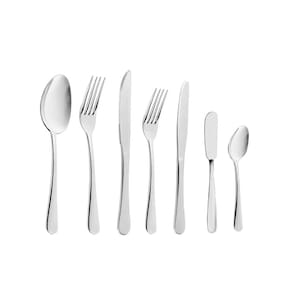 Contem: 6 Garfos de Mesa Medidas: 20 x 2,5 x 0,25 cm 6 Colheres de Sopa Medidas: 20 x 4,2 x 0,25 cm 6 Facas de Mesa Serrilhada Medidas: 23 x 2 x 0,4 cm 6 Garfos de Salada Medidas: 18 x 2,3 x 0,25 cm 6 Facas de Salada Medidas: 20 x 2 x 0,25 cm 6 Colheres Pequena Medidas: 14 x 3 x 0,15 cm 6 Espatulas de Manteiga Medidas: 15 x 1,5 x 0,15 cm Material: Aço Inoxidavel Pode ser levado a maquina de lavar louças