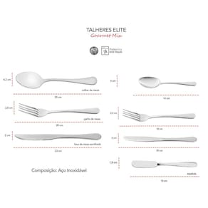 Faqueiro com talheres de mesa, salada, sobremesa e espatula em aço inoxidavel. A linha de Talheres Elite da Gourmet Mix possui design atual, com linhas arredondadas sem detalhes nos cabos, com maior espessura e acabamento em alto brilho, o que da aos talheres uma aparencia leve e sofisticada. Sao produzidos totalmente em aço inox de qualidade, garantindo a durabilidade, beleza e higiene.