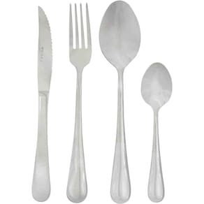 Medidas dos Talheres: Colher: 21cm de comprimento X 4,5cm de largura na concha X 2,1cm de largura na ponta do cabo. Faca: 21,7cm de comprimento X 2,1cm de largura. Garfo: 21,3cm de comprimento X 2,8cm de largura X 2,1cm na ponta do cabo. Colher de Sobremesa: 14,8cm de comprimento X 3,2cm de largura na concha X 1,9cm de largura na ponta do cabo.