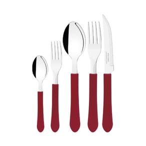 Informações adicionais: Ean: 5717544567412 Validade: indeterminada Conteudo: 4 - facas para churrasco 4'' 4 - garfos de mesa 4 - colheres de sopa 4 - garfos para sobremesa 4 - colheres para chá Tamanho aproximado do pote: a:23,5xl:9,5cm Peso aproximado: 455g Tipo de produto: conjunto de talheres / faqueiro com 20 pecas leme no pote Cor: prata com cabo vermelho Composição: inox e plastico