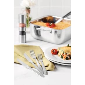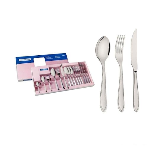 Peças totalmente feitas de aço inox, altamente duráveis, mantêm suas características , preservando a beleza, a higiene e a durabilidade do material. Colheres com bojo em formato simétrico e bordas cuidadosamente arredondadas. Garfos com dentes polidos na parte interna, com formato apropriado para a boca e bordas arredondadas para proporcionar maior conforto no uso. Facas totalmente temperadas, que garantem maior durabilidade no fio de corte e maior resistência à corrosão, e por suas características de temperabilidade, não riscam as porcelanas. Acabamento em brilho, com detalhes no cabo. Próprias para uso diário combinam com qualquer ambiente. Podem ser lavadas diariamente na máquina de lavar louças.