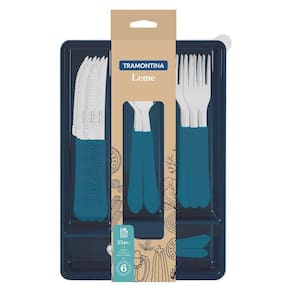 Para completar suas refeições e levar muito mais cor para sua mesa, conte com o Faqueiro Tramontina Leme com Lâminas em Aço Inox e Cabos de Polipropileno Azul Oceano com Gaveteiro 25 peças. Com peças produzidas com lâminas em aço inox e cabos desenvolvidos em polipropileno, ele é resistente, durável e deixa a hora de saborear sua comida preferida ainda mais especial. Ele é ainda muito fácil de limpar e pode ser levado à máquina de lavar louças, facilitando muito mais sua rotina na cozinha. Ele também acompanha gaveteiro plástico, acessório perfeito para você armazenar e guardar os talheres em sua gaveta. Com a Tramontina, você tem o melhor para sua cozinha Contém: 6 facas para Churrasco 4 6 Garfos de Mesa 6 Colheres de Mesa 6 Colheres para Chá 1 Gaveteiro Importante: Lâminas de aço inox. As lâminas das facas têm maior durabilidade do fio devido ao tratamento térmico. Os garfos e colheres garantem maior resistência devido a espessura do aço e a estampagem das lâminas. Os cabos de polipropileno possuem maior resistência e durabilidade. Gaveteiro ideal para armazenar e guardar os talheres na gaveta. Podem ir à máquina de lavar louças facilitando seu dia a dia. Tenha cuidado ao manusear produtos cortantes e perfurantes e mantenha-os fora do alcance das crianças. Para maior durabilidade dos produtos recomenda-se secar bem antes de guardar, mesmo após lavagem em máquina.