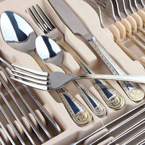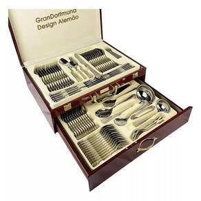 Faqueiro Luxuoso Inox 84 Peças Banhando A Ouro 24K Faqueiro Inox Luxo 84 Peças Dourado com Maleta Peças em Aço Inoxidável 18/10 3.0mm de espessura com filetes dourados, design exclusivo e sofisticado Faqueiro leva charme, elegância e bom gosto para a composição da sua mesa. Um faqueiro clássico produzido em aço inox, ricamente adornado e exclusivo. Todas as peças são produzidas em aço inoxidável. Apresentam espessura de 3mm e acabamento espelhado. Caixa produzida no estilo maleta reforçada com fechamento em sistema de código. 01 Maleta com:12 Colheres12 Garfos principais12 Facas principais12 colheres chá/sobremesa12 Garfos sobremesa01 Espátula pata bolo02 Garfos peixe01 Concha grande01 Concha pequena01 Colher açucareiro01 Pegador02 Colheres para servir02 Colheres de salada 1 ano. Marca: Não Informado