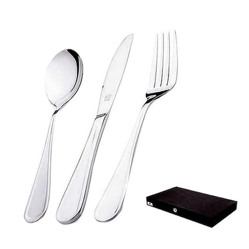 Contém: 6 colheres mesa: 20,1 cm / 6 garfos de mesa: 20,6 cm / 6 facas de mesa: 22,7 cm / 6 colheres de sobremesa: 18,3 cm / 6 garfos de sobremesa: 18,5 cm / 6 facas de sobremesa 18,5cm / 6 colheres de chá: 12,8 cm