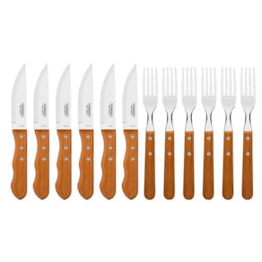 - Facas com lâmina de 12,5cm. - Garfos com aço de 10cm. - Lâmina em aço inox ,maior resistência á desgaste por fricção, raspagem. - Fácil manuseio e limpeza sempre cuidando com navalha e pontas . - 12 Unidade por embalagem. 6 facas 25,5cm e 6 garfos 22cm .