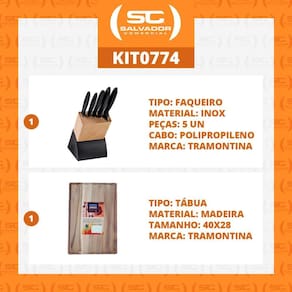 OBS: Veja na descrição os itens que acompanham o jogo. COMPONENTES DO KIT: 1 - Jogo de 6 PÇ 4 facas, 1 garfo e Suporte de Madeira Plenus - Tramontina 23498028 1 - Tábua de Cortar Servir Carne Churrasco Retangular 28x40 em Madeira - Tramontina 13456052 Jogo de 6 PÇ 5 pç e Suporte de Madeira Plenus Lâminas Inox Cabos Polipropileno - Tramontina 23498028 - Cor do cabo: Preto - Material do cabo: Polipropileno - Peso Líquido: 1,1 kg. - Peso Bruto: 1,3 kg. - Dimensões Produto: 30cm A x 12cm L x 21cm C. - Dimensões Embalagem 31cm A x 13cm L x 22cm C. - Conteúdo do jogo: 1 - 29900500 - Base de Madeira 1 - 23426007 - Faca Chef Lâmina 7 17,78cm 1 - 23425005 - Faca Desossar Lâmina 5 12,7cm 1 - 23420003 - Faca para Legumes e FrutasLâmina 3 7,62cm 1 - 23428005 - Faca para Tomates Lâmina 5 12,7cm 1 - 23432000 - Garfo Trinchante Tábua de Cortar Servir Carne Churrasco Retangular 28x40 em Madeira - Tramontina 13456052 : 90 dias para vicios ou defeitos de fabricação Mais do que um prato típico brasileiro e, principalmente, gaúcho, o churrasco é uma tradição, e a tradição diz que a carne, depois de assada, deve ser picada em uma tábua de madeira. Para preservar A tradição e garantir a qualidade do seu assado, a Tramontina desenvolveu a Tábua para Churrasco Retangular Grande em Madeira Teca 40 x 28 cm. - EAN13: 7896403792658 - DUN14: 17896403792655 - NCM: 4419.90.00 - Peso Líquido: 0,91 kg. - Peso Bruto: 1,2 kg. - Dimensões Produto: 1,8cm A x 28cm L x 40cm C. - Dimensões Embalagem 2,0cm A x 30cm L x 41cm C.