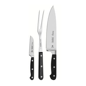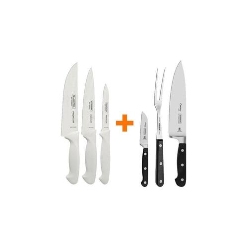 OBS: Veja na descrição os itens que acompanham o jogo. COMPONENTES DO KIT: 1 - Jogo de Faca Premium 3 PÇ - Tramontina 24499811 1 - Jogo de Facas Profissional Century Lâmina em Aço Inox 3 peças - Tramontina 24099038 Jogo de Facas Premium com Lâminas em Aço Inox e Cabos de Polipropileno Branco 3 Peças - Tramontina 24499811 : 90 dias para vícios ou defeitos de fabricação. As lâminas de aço inox tem maior durabilidade do fio devido ao tratamento térmico. Os cabos de polipropileno possuem maior resistência e durabilidade. Podem ir à máquina de lavar louças facilitando seu dia a dia. - Cor do cabo: Branco - Material do cabo: Polipropileno - Peso Líquido: 0,20 kg. - Peso Bruto: 0,25 kg. - Medidas Embalagem: 2,0cm A x 16cm L x 38cm C - Conteúdo do jogo: 1 - 24472186 - Faca Utility Lâmina 6 15,24cm 1 - 24473187 - Faca para Cozinha lâmina 7 17,78cm 1 - 24470184 - Faca para Frutas e Legumes Lâmina 4 10,16cm Jogo de Facas Profissional Century Lâmina em Aço Inox 3 peças - Tramontina 24099038 - Ideal para cortar, fatiar e picar. - A lâmina forjada de aço inox especial garante um fio com maior durabilidade e precisão. - A lâmina possui tratamento térmico diferenciado, composto por têmpera, sub-zero e revenimento. - E conta com dureza da lâmina de 55 e 58 HRC, que garante maior resistência do fio e precisão no corte. - O cabo de policarbonato reforçado com fibra de vidro garante alta durabilidade, equilíbrio e segurança. - O cabo ergonômico proporciona maior segurança, equilíbrio e conforto na hora do corte. - Pode ir à máquina de lavar louças facilitando seu dia a dia. - Cor do cabo: Preto - Material do cabo: Policarbonato com Fibra de Vidro - Peso Líquido: 0,45 kg. - Peso Bruto: 0,60 kg. - Dimensões Embalagem 1,8cm A x 28cm L x 41cm C. Conteúdo do jogo: 1 - 24011108 - Faca Chef 8 20,32cm 1 - 24000103 - Faca para Legumes e Frutas 3 7,62cm 1 - 24215100 - Garfo Trinchante 7,5 19,05cm Marca: Não Informado