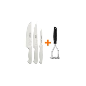 OBS: Veja na descrição os itens que acompanham o jogo. COMPONENTES DO KIT: 1 - Jogo de Faca Premium 3 PÇ - Tramontina 24499811 1 - Amassador Esmagador de Batatas e Feijão Manual Utilitá em Aço Inox - Tramontina 25655100 Jogo de Facas Premium com Lâminas em Aço Inox e Cabos de Polipropileno Branco 3 Peças - Tramontina 24499811 : 90 dias para vícios ou defeitos de fabricação. As lâminas de aço inox tem maior durabilidade do fio devido ao tratamento térmico. Os cabos de polipropileno possuem maior resistência e durabilidade. Podem ir à máquina de lavar louças facilitando seu dia a dia. - Cor do cabo: Branco - Material do cabo: Polipropileno - Peso Líquido: 0,20 kg. - Peso Bruto: 0,25 kg. - Medidas Embalagem: 2,0cm A x 16cm L x 38cm C - Conteúdo do jogo: 1 - 24472186 - Faca Utility Lâmina 6 15,24cm 1 - 24473187 - Faca para Cozinha lâmina 7 17,78cm 1 - 24470184 - Faca para Frutas e Legumes Lâmina 4 10,16cm Amassador Esmagador de Batatas e Feijão Manual Utilitá em Aço Inox - Tramontina 25655100 - Utensílio com lâmina de aço inox que proporcionam resistência durante o uso. - O cabo de polipropileno possui furo passante possibilitando que seja pendurado na sua cozinha. - Pode ir à máquina de lavar louças facilitando seu dia a dia. - Peso Líquido: 0,1100 kg. - Peso Bruto: 0,1200 kg. - Medida Produto: 23,8cm A x 83cm L x 79cm C - Medida Embalagem: 27cm A x 89cm L x 80cm C Marca: Não Informado