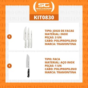 COMPONENTES DO KIT: 1 - Jogo de Faca Premium 3 PÇ - Tramontina 24499811 1 - Faca Master Santoku Century Lâmina Aço Inox 7 Polegadas - Tramontina 24020107