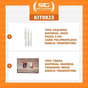 OBS: Veja na descrição os itens que acompanham o jogo.COMPONENTES DO KIT:1 - Jogo de Faca Premium 3 PÇ - Tramontina 244998111 - Tábua de Cortar Servir Carne Churrasco Retangular 28x40 em Madeira - Tramontina 13456052Jogo de Facas Premium com Lâminas em Aço Inox e Cabos de Polipropileno Branco 3 Peças - Tramontina 24499811Garantia: 90 dias para vícios ou defeitos de fabricação.As lâminas de aço inox tem maior durabilidade do fio devido ao tratamento térmico.Os cabos de polipropileno possuem maior resistência e durabilidade.Podem ir à máquina de lavar louças facilitando seu dia a dia.- Cor do cabo: Branco- Material do cabo: Polipropileno- Peso Líquido: 0,20 kg.- Peso Bruto: 0,25 kg.- Medidas Embalagem: 2,0cm A x 16cm L x 38cm C- Conteúdo do jogo:1 - 24472186 - Faca Utility Lâmina 6 15,24cm 1 - 24473187 - Faca para Cozinha lâmina 7 17,78cm 1 - 24470184 - Faca para Frutas e Legumes Lâmina 4 10,16cm Tábua de Cortar Servir Carne Churrasco Retangular 28x40 em Madeira - Tramontina 13456052Garantia: 90 dias para vicios ou defeitos de fabricaçãoMais do que um prato típico brasileiro e, principalmente, gaúcho, o churrasco é uma tradição, e a tradição diz que a carne, depois de assada, deve ser picada em uma tábua de madeira. Para preservara tradição e garantir a qualidade do seu assado, a Tramontina desenvolveu a Tábua para Churrasco Retangular Grande em Madeira Teca 40 x 28 cm.- Peso Líquido: 0,91 kg.- Peso Bruto: 1,2 kg.- Dimensões Produto: 1,8cm A x 28cm L x 40cm C.- Dimensões Embalagem 2,0cm A x 30cm L x 41cm C. Marca: Não Informado