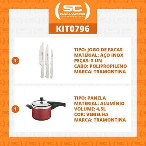 OBS: Veja na descrição os itens que acompanham o jogo.COMPONENTES DO KIT:1 - Jogo de Faca Premium 3 PÇ - Tramontina 244998111 - Panela Pressão 4,5 Lts antiaderente Tramontina VancouverJogo de Facas Premium com Lâminas em Aço Inox e Cabos de Polipropileno Branco 3 Peças - Tramontina 24499811Garantia: 90 dias para vícios ou defeitos de fabricação.As lâminas de aço inox tem maior durabilidade do fio devido ao tratamento térmico.Os cabos de polipropileno possuem maior resistência e durabilidade.Podem ir à máquina de lavar louças facilitando seu dia a dia.- Cor do cabo: Branco- Material do cabo: Polipropileno- Peso Líquido: 0,20 kg.- Peso Bruto: 0,25 kg.- Medidas Embalagem: 2,0cm A x 16cm L x 38cm C- Conteúdo do jogo:1 - 24472186 - Faca Utility Lâmina 6 15,24cm 1 - 24473187 - Faca para Cozinha lâmina 7 17,78cm 1 - 24470184 - Faca para Frutas e Legumes Lâmina 4 10,16cm Panela Pressão 4,5 Lts antiaderente Tramontina Vancouver- NÃO indicado para fogão Indução.Característica e Descrição Ficha Técnica:- Modelo Vancouver Starfloncód. 20582/620 GrafiteCód. 20582/720 Vermelha - Eficiente e Segura.- Produzida em alumínio com revestimento interno e externo em antiaderente Starflon T1- Tampa em aluminio com acabamento externo polido e interno satinado tampa não é antiaderente .- Alças e cabo superior e inferior em baquelite.- Sitema de segurança lateral.- Válvula de segurança.- Válvula de trabalho alívio de pressão .- Revestimento antiaderente StarFlon.- Maior resistência á desgaste por fricção, raspagem.- Pode cozinhar fogão gás, elétrico e também vitrocerâmico.- Fácil manuseio e limpeza.- Capacidade 4,5L.- 1 Unidade por embalagem.- 3 sistema de segurança 1 cabo e 2 na tampa. - Peso Líquido: 1,6 Kg- Peso Bruto: 1,75 Kg- Medidas internas panela : 19,5cm diâmetro x 14,5 Alt. verifique o nivel máxima informado no interior panela - Medida Externa: 22,9cm A x 40,8cm L x 23,1 P - mais detalhes, na foto do anuncio .- Medida Embalagem: 21 cm Alt x 39cm L x 23cm P.