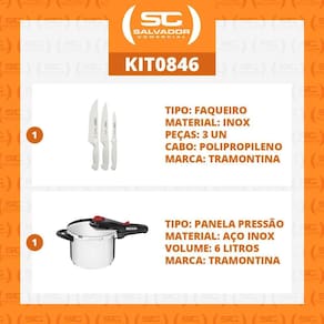 OBS: Veja na descrição os itens que acompanham o jogo.COMPONENTES DO KIT:1 - Jogo de Faca Premium 3 PÇ - Tramontina 244998111 - Panela com Fundo Triplo em Aço Inox 22 cm 6 L - Solar - Tramontina Cód. 62516223jogo de Facas Premium com Lâminas em Aço Inox e Cabos de Polipropileno Branco 3 Peças - Tramontina 24499811Garantia: 90 dias para vícios ou defeitos de fabricação.As lâminas de aço inox tem maior durabilidade do fio devido ao tratamento térmico.Os cabos de polipropileno possuem maior resistência e durabilidade.Podem ir à máquina de lavar louças facilitando seu dia a dia.- Cor do cabo: Branco- Material do cabo: Polipropileno- Peso Líquido: 0,20 kg.- Peso Bruto: 0,25 kg.- Medidas Embalagem: 2,0cm A x 16cm L x 38cm C- Conteúdo do jogo:1 - 24472186 - Faca Utility Lâmina 6 15,24cm 1 - 24473187 - Faca para Cozinha lâmina 7 17,78cm 1 - 24470184 - Faca para Frutas e Legumes Lâmina 4 10,16cm Panela com Fundo Triplo em Aço Inox 22 cm 6 L - Solar - Tramontina Cód. 62516223- Mais praticidade e qualidade na sua cozinha- Produzida em aço inox- Pode ser utilizada em fogão a gás, elétrico, vitrocerâmico ou por indução- Cabo e alça antitérmicos- Fundo triplo: aço inox, alumínio, aço inox- Distribuição de calor uniforme, cozimento rápido e economia de energia- Alimentos aquecidos por mais tempo- Sistema de descompressão- Medidor de capacidade interno- 5 dispositivos de segurança- Capacidade mínima: 250ml de líquido 1/4 litro - Capacidade máxima: 2/3 da capacidade total da panela alimento + líquido - Atestada pela Norma Nacional de Segurança / INMETRO- Acompanha manual de instruçõesCapacidade da panela: 6 litrosPressão de trabalho: 80/95 kPaPeso líquido: 3,06 kgPeso bruto: 3,85 kgMedidas do produto:23,1cm A x 24,7cm L x 45cm PDiâmetro da panela: 22cmMedidas da embalagem: 25,4cm A x 27,2cm L x 44,1cm PGarantia de 2 anos contra defeito de fabricação. Marca: Não Informado
