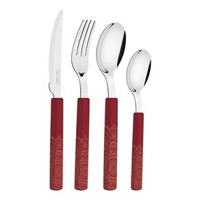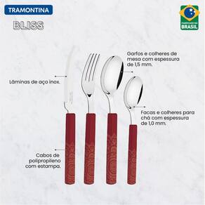 Deixe a composição da sua mesa impecável e cheia de estilo com o faqueiro Tramontina Bliss com lâminas em aço inox e cabos de polipropileno carmim 16 peças. Suas peças são produzidas com lâminas de aço inox, espessura e tratamento térmico que proporcionam maior resistência, durabilidade aos garfos e colheres e um excelente fio de corte às facas. Os cabos são em polipropileno na cor carmim e possuem uma linda serigrafia de mandalas, perfeita para agregar muito mais charme e beleza às suas refeições. Escolha os talheres Tramontina e veja sua mesa transformada!