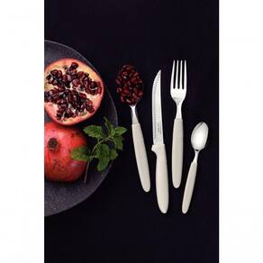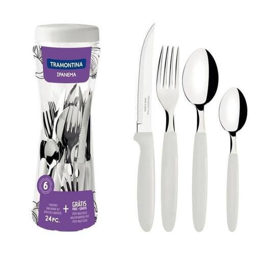 Faqueiro Tramontina Ipanema 24 Peças Inox Branco A linha IPANEMA coloca muito mais cor na sua mesa. São várias opções para você escolher a que mais combina com a sua casa e sua mesa. Experimente misturar as cores e você terá , em cada refeição, composições modernas e alegres. Recomendações de Uso: Modo de uso: antes da primeira utilização, remova as eventuais etiquetas e lave usando apenas uma esponja macia, sabão ou detergente neutro. Outros tipos de produtos, como palha de aço, poderão riscar ou prejudicar o acabamento da peça. Enxágue cada item a fim de remover totalmente os resíduos dos produtos de limpeza, que, por serem abrasivos, podem danificar o inox. Após a lavagem enxaguar e secar bem a peça, caso contrário, as substâncias químicas da água (cloro) poderão causar manchas. Para maior durabilidade dos produtos recomenda-se secar bem antes de guardar, mesmo após lavagem em máquina. Evite o direto da peça com superfícies quentes, pois poderá provocar deformações ao produto. Evite atrito entre as peças durante o processo de lavagem e no armazenamento, para mantê-la sem riscos.- Foto meramente ilustrativa. Informações Adicionais: