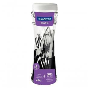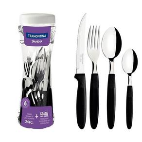Faqueiro Tramontina Ipanema 24 Peças Inox Preto A linha IPANEMA coloca muito mais cor na sua mesa. São várias opções para você escolher a que mais combina com a sua casa e sua mesa. Experimente misturar as cores e você terá , em cada refeição, composições modernas e alegres. Recomendações de Uso: Modo de uso: antes da primeira utilização, remova as eventuais etiquetas e lave usando apenas uma esponja macia, sabão ou detergente neutro. Outros tipos de produtos, como palha de aço, poderão riscar ou prejudicar o acabamento da peça. Enxágue cada item a fim de remover totalmente os resíduos dos produtos de limpeza, que, por serem abrasivos, podem danificar o inox. Após a lavagem enxaguar e secar bem a peça, caso contrário, as substâncias químicas da água (cloro) poderão causar manchas. Para maior durabilidade dos produtos recomenda-se secar bem antes de guardar, mesmo após lavagem em máquina. Evite o direto da peça com superfícies quentes, pois poderá provocar deformações ao produto. Evite atrito entre as peças durante o processo de lavagem e no armazenamento, para mantê-la sem riscos.- Foto meramente ilustrativa. Informações Adicionais: