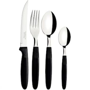 Caracteristicas: Laminas de aco inox As laminas das facas tem maior durabilidade do fio devido ao tratamento termico Os garfos e colheres garantem maior resistencia devido a espessura do aco e a estampagem das laminas Os cabos de polipropileno possuem maior resistencia e durabilidade Podem ir a maquina de lavar loucas facilitando seu dia a dia