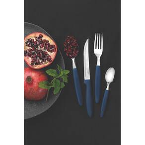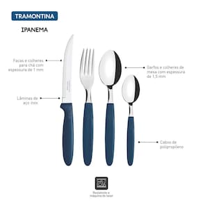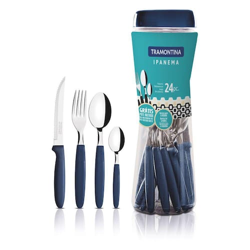 Faqueiro Tramontina Ipanema com Lâminas em Aço Inox e Cabos de Polipropileno Azul com Pote Plástico 24 Peças Para quem gosta de uma mesa linda e colorida, o Faqueiro Tramontina Ipanema com Lâminas em Aço Inox e Cabos de Polipropileno Azul com Pote Plástico 24 Peças é a escolha perfeita! Os talheres são todos produzidos com lâminas em aço inox e cabos de polipropileno, que garantem alta resistência e durabilidade, além de levar muito mais conforto no manuseio. Suas refeições serão repletas de alegria com esse faqueiro cheio de cor e estilo!