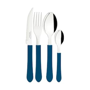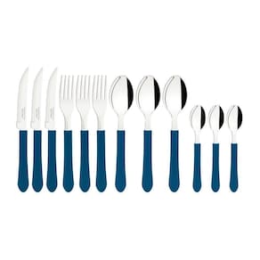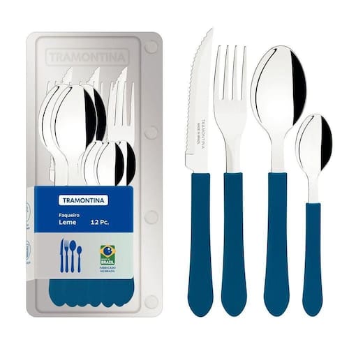 Cor, alegria e vivacidade para suas refeições com o faqueiro Tramontina Leme, com lâminas em aço inox e cabos de polipropileno azul, contendo 12 peças. Desenvolvido para uso no dia a dia, suas peças têm produção em materiais que garantem sua qualidade, resistência e durabilidade: lâminas em aço inox e cabos de polipropileno. Com estampagem e espessura especiais, seus garfos e colheres garantem maior resistência e durabilidade, e suas facas, com tratamento térmico na lâmina, possuem alto poder de corte. Tudo isso para garantir o melhor para sua mesa. Os talheres ainda são muito fáceis de limpar e podem ir à máquina de lavar louças, otimizando sua rotina na cozinha!