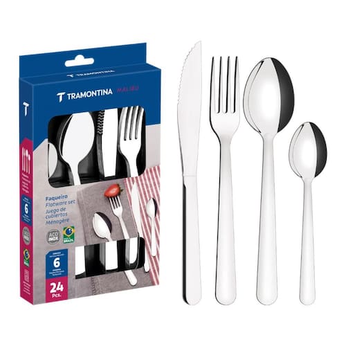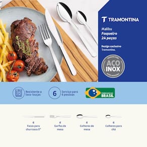 Impressione seus convidados com o faqueiro Tramontina Malibu em aço inox 24 peças! Um faqueiro totalmente produzido em aço inox que oferece durabilidade e resistência, além de deixar sua mesa muito mais elegante e cheia de estilo, pois suas peças contam com um acabamento que tornam o talher ainda mais especial. Muito fáceis de limpar, os talheres ainda podem ir à máquina de lavar louças. A companhia ideal para as refeições do seu dia!