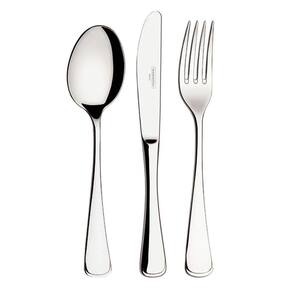Composição - 12 Colher de mesa;12 Colher para café;12 Colher para chá;12 Colher para sobremesa;12 Faca de mesa forjada;12 Faca para sobremesa forjada;12 Garfo de mesa;12 Garfo para sobremesa;1 Colher para Salada;1 Colher para arroz;1 Concha terrina;1 Garfo para Salada;1 Pá para açúcar.