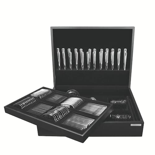- Dimensões da embalagem (Compr. X Larg. X Alt.): 500x395x130 mm. Linha: Pacific | Apto para lava-louças: Sim | EmbalagemLargura-cm: 40 | Dias Fornecedor: 0 | Material da lâmina: Aço inoxidável | cor: prata | EmbalagemAltura-cm: 14 | É kit de : Sim | Material do cabo: Aço inoxidável | EmbalagemComprimento-cm: 51 | Talheres incluídos: 12 Colher de mesa, 12 Garfo de mesa, 12 Faca de mesa, 12 Colher para sobremesa, 12 Garfo para sobremesa, 12 Faca para sobremesa, 12 Colher para chá, 12 Colher para café, 1 Concha Terrina, 1 Colher para arroz, 1 Pá para açúcar, 2 Talheres para salada | Quantidade de peças: 101 | Tipo de embalagem: Caixa de Madeira | Marca: Tramontina | Cubagem: 0.028560 | Modelo: Pacific c/Estojo 101 peças | Peso Líquido: 0.0000
