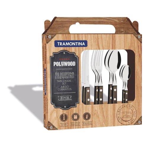 Faqueiro Tramontina Polywood com Lâminas em Aço Inox e Cabos de Madeira Castanho 24 Peças Lâminas de aço inox. As lâminas das facas têm maior durabilidade do fio devido ao tratamento térmico. As lâminas dos garfos contam com maior espessura e uma estampagem do aço que garante maior resistência, evitando deformações. Os cabos de madeira tratada Polywood são resistentes à impactos e alta temperaturas garantindo maior resistência e durabilidade. Rebites de alumínio. Podem ir à máquina de lavar louças facilitando seu dia a dia. Recomendações de uso Antes da primeira utilização, lave bem as peças e seque-as. Tenha cuidado ao manusear produtos cortantes e perfurantes e mantenha-os fora do alcance de crianças. Para maior durabilidade dos produtos, recomenda-se secar bem antes de guardar, mesmo após lavagem em máquina.Para descarte dos produtos e embalagens siga as orientações de reciclagem vigentes.