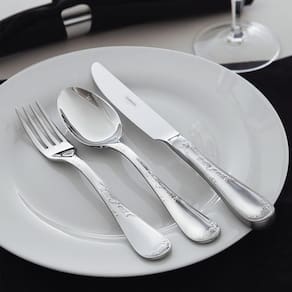 O Faqueiro Renascença se destaca pelo seu design sofisticado com acabamento em brilho e fosco, além de detalhes em alto relevo nos cabos. As peças são feitas de aço inoxidável, garantindo durabilidade e resistência à corrosão, e as facas possuem lâminas temperadas que não riscam porcelanas.