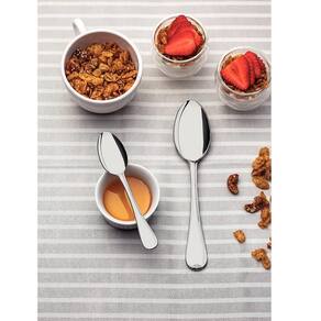CONTEÚDO DO JOGO: 12 Colher de mesa 1 Colher para arroz 12 Colher para café 12 Colher para chá 12 Colher para sobremesa 1 Concha terrina 12 Faca de mesa forjada 12 Faca para sobremesa forjada 12 Garfo de mesa 12 Garfo para sobremesa 1 Pá para açúcar 2 Talheres para salada