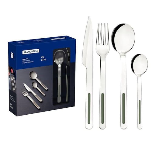Poucos momentos são tão especiais quanto estar à mesa com as pessoas que amamos, saboreando uma refeição deliciosa. E para compor a mesa com muita beleza e estilo, escolha o faqueiro Tramontina Vik em aço inox com detalhes em polipropileno oliva 24 peças. Com design minimalista, os talheres são produzidos em aço inox com acabamento polido fosco e detalhes em polipropileno na cor oliva, onde na parte frontal do cabo o metal fica exposto e no verso é detalhe em polipropileno. Para garantir alta qualidade e eficiência, as facas tem contam com alto poder de corte e os garfos e colheres tem estampagem e espessura especiais, que garantem maior resistência. Além de todas essas características, o faqueiro pode ir à máquina de lavar louças e deixará seu dia a dia na cozinha muito mais prático!