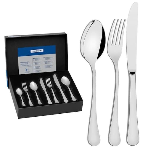 - Tenha os mais belos talheres no seu de mesa com o Faqueiro Tramontina em Aço Inox com Facas de Mesa Forjadas Acabamento Brilho 42 Peças Peças da linha Zurique.