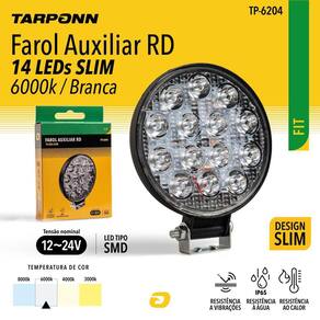 O farol auxiliar rd 14 leds da linha fit tarponn, feito com liga de alumínio feito com liga de alumínio, tem 14 leds tipo smd, com iluminação branca fria 6000k e design slim com encaixe universal, indicado para off-roads, barcos, caminhões, máquinas agrícolas ou demais veículos.