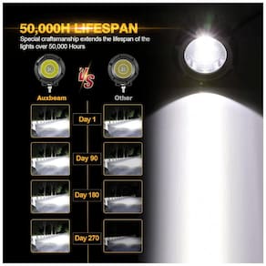 Padrão de feixe combinado e espalhado. A luz de condução redonda do Auxbeam de 50W apresenta um padrão de feixe combinado, com refletores Spot Spread perfeitamente angulados, para máxima distância à frente e iluminação periférica aprimorada ao longo das bordas da estrada