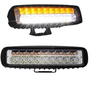 Farol led 15cm 54w com led branco e ambar Farol de led possui 18 leds 15cm, com lente flood que tem ótima abertura espalha bem a luz . Possui o fio preto negativo vermelho positivo . As luzes são estrobos alternando entre branco e o âmbar.
