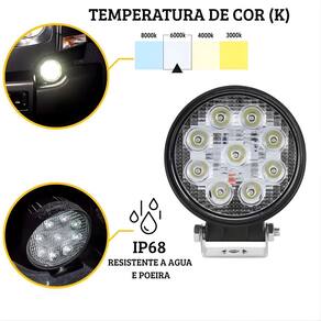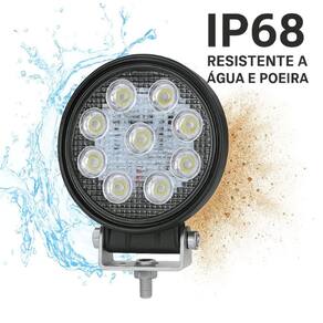 Especificações: - Lente em Acrílico - Carcaça em Alumínio Fundido - Farol com LEDs Integrados - Possui 9 LEDs de Alta Intensidade - Temperatura de cor: 6000K (branco) - Fluxo Luminoso: 2400 Lúmens - Potência de Cada LED: 3W x 9 - Potência Total: 27W - Alimentação: 10V/30V - Voltagem Compatível com Carros, Motos, Caminhões e Implementos Agrícolas - Alta Durabilidade - IP Rate: IP68 resistente a água e poeira - Composição: Alumínio Fundido, Plásticos PS / PMMA / PC, Aço Inox, Fio de Cobre e Componentes Eletrônicos - Observação: Carcaça Grossa Alumínio
