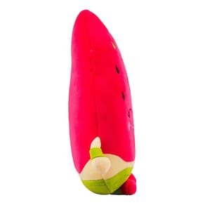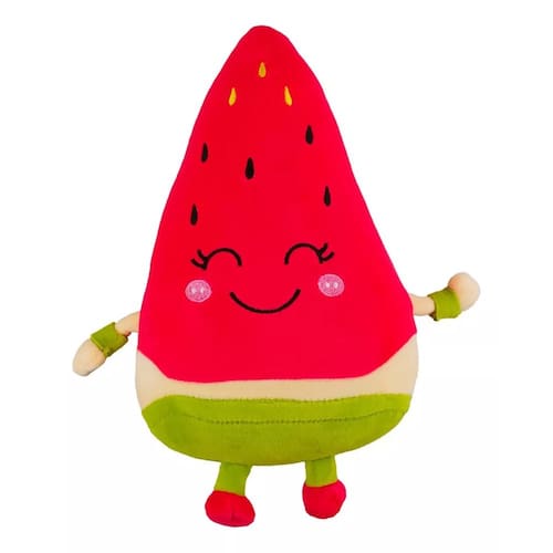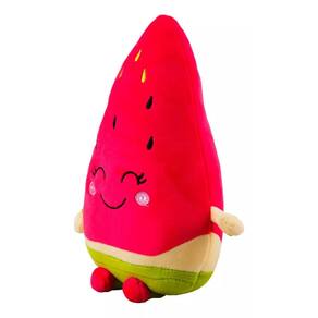 Pelúcia no formato de uma fatia de melancia com 26 cm de altura. Melancia de pelúcia tem um rosto com mãozinhas e pezinhos soltos. Material: poliéster; Enchimento: fibra de poliéster; Produto certificado por Órgão acreditado pela CGCRE do INMETROCódigo: AE-007-F(MELANCIA)Peso: 100gAltura: 26cmLargura: 14cmComprimento: 10cm