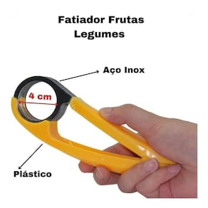 Fatiador Cortador Em Inox De Banana Chips Legumes E Frutas FitnessAgilize a preparação de suas receitas Fatiador em Aço Inoxidável.Com esse Fatiador você tem bonitas fatias de banana, salsichas, pepino ou que desejar fatiar.Mais prático do que com a mão e especialmente, visualmente muito mais atraente.Fatias de alimentos do mesmo tamanho para cozinhar, assar, decoração, cosméticos, como sobremesa ou como um lanche, salada de frutas e etc.Características:Material: O produto é feito em aço inox com corpo em Resina ABS resistente.Dimensões do anel de corte: 4 Cm