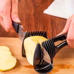 A Pinça Fatiadora Multiuso da linha Gourmet da Prana é ideal para auxiliar no corte de cebolas, tomates e ovos, mantendo-os firmes.