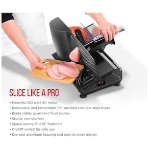 Fatie seus favoritos use seu cortador de alimentos para cortar facilmente presunto, peru, rosbife, carne seca, queijo, pão, frutas e legumes em sua própria cozinha. O cortador de alimentos está equipado com um seletor de espessura ajustável para personalizar as fatias do jeito que você gosta delas. DESIGN DE ECONOMIA DE ESPAÇO Com um design elegante e compacto, este fatiador de frios de 22 x é pequeno o suficiente para a maioria dos armários e bancadas perfeito para preparação de almoço durante a semana ou elaboração de refeições gourmet. Ótimo para fazer carne seca caseira, sanduíches deli, tábuas de charcutaria, frutas fatiadas para desidratação, pratos de festa, aperitivos e muito mais. FÁCIL DE USAR E LIMPEZA O potente motor CA de 180 watts e a lâmina serrilhada de aço inoxidável permitem que os alimentos deslizem pelo fatiador com facilidade. Lâmina de aço inoxidável serrilhada de removível e retrátil e carcaça de alumínio fundido são fáceis de limpar.120V. E INTELIGENTE Pés antiderrapantes resistentes, proteção de segurança da lâmina e empurrador de alimentos garantem que o fatiador de alimentos permaneça no lugar para que você possa manter um aperto firme durante a operação O interruptor liga, desliga oferece segurança adicional para que você possa cortar com segurança para uma fatia personalizada e limpa sempre Marca: Não Informado