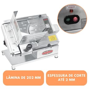 Ideal para uso em residências e pequenas lanchonetes. Sua lâmina é de 202 milímetros e seu motor de 1/3 de HP tem capacidade de fatiar peças de até 12x10 centímetros sem ficar retalhos.